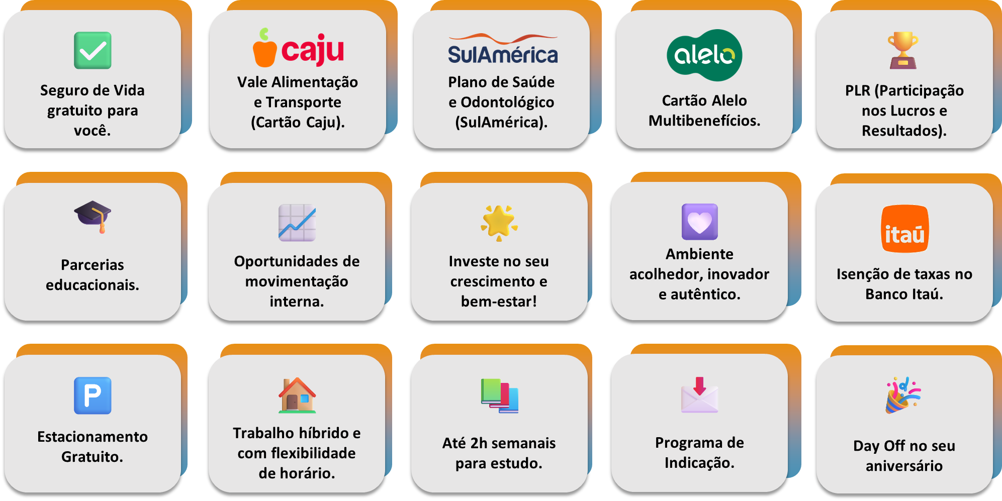 Imagine integrar um time dinâmico, colaborativo e cheio de energia, onde suas ideias são valorizadas e há espaço para crescimento profissional.